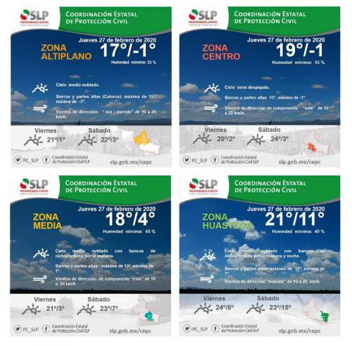 De acuerdo a la Dirección Local de la Comisión Nacional del Agua (CNA) las temperaturas más bajas se presentaron en la capital potosina donde el termómetro bajó a 0.5 grados centígrados, en Matehuala y Rioverde la temperatura más baja fue de 1 grado centígrado, mientras que en Soledad de Graciano Sánchez fue de 2.