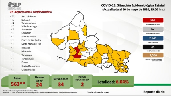 Miguel Lutzow Steiner, vocero del Comité de Seguridad en Salud, dio a conocer que San Luis Potosí se incorporan 24 nuevos casos de coronavirus para llegar a 563 casos confirmados de 3,566 personas estudiadas, de las que se han descartado 2,941; la cifra de pendientes de estudio son 62 sospechosos, y el número de lamentables decesos se subió a 34.