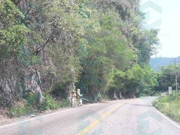 Personal del Ayuntamiento del municipio de Xilitla dan mantenimiento a la entrada de la carretera, donde están cortando árboles para que los automovilistas tengan mejor visibilidad.