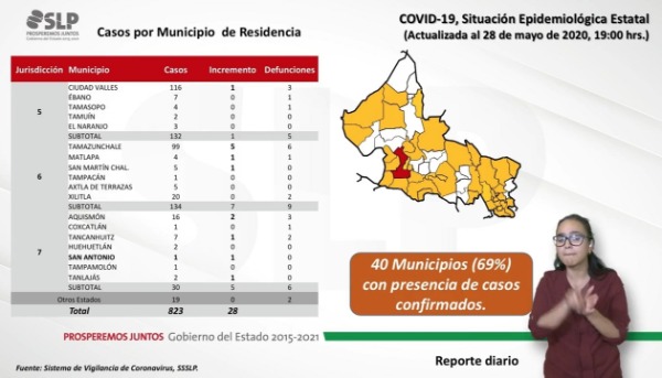Sobre los nuevos 28 casos positivos a coronavirus, se detalló que se trata de 18 mujeres y 10 hombres, en un rango de edad de entre 13 y 69 años; mismos que tienen como residencia en dos en Aquismón; uno en Ciudad Valles; uno en Matehuala; uno en Matlapa; uno en Mexquitic de Carmona; tres en Rioverde; uno en San Antonio; seis la capital potosina; uno en San Martín Chalchicuautla; dos en Santa María del Río; cinco en Tamazunchale; uno en Tancanhuitz; uno en Tanlajás; uno en Villa de Arista y uno en Villa de Zaragoza, cuyo tipo de exposición se determinó como local; mismos que habrían iniciado síntomas durante el periodo del 19 al 27 de mayo.
