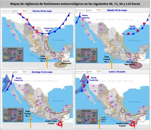 • De acuerdo con los pronósticos para las próximas horas, se prevé que el frente No. 65 en interacción con un canal de baja presión sobre el oriente de México, ocasionará lluvias fuertes a muy fuertes en los estados del noreste, oriente y centro del país, además de puntuales intensas en Tamaulipas, San Luis Potosí, Hidalgo y Puebla, todas acompañadas de descargas eléctricas, granizadas y rachas de viento durante el paso de las tormentas. La Onda Tropical No. 2 será absorbida por una zona de baja presión con probabilidad para desarrollo ciclónico y originará lluvias fuertes a puntuales intensas en zonas del sur y sureste mexicano, incluida la Península de Yucatán, además de lluvias puntuales torrenciales en Veracruz y norte de Oaxaca; precipitaciones que podrían generar posibles deslaves, aumento en los caudales de ríos y arroyos e inundaciones en zonas bajas de dichos estados. Finalmente, una circulación anticiclónica en niveles medios de la atmósfera, mantendrá temperaturas máximas superiores a 40 grados Celsius (°C) en 9 entidades del territorio nacional.