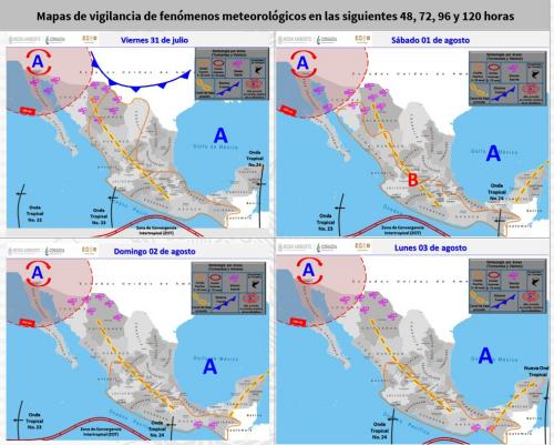 Para hoy viernes, la onda tropical No. 23 recorrerá el occidente del país, mantendrá el potencial de lluvias fuertes en Colima y Nayarit y muy fuertes en Michoacán y Jalisco, las cuales se acompañarán de descargas eléctricas y posible caída de granizo.