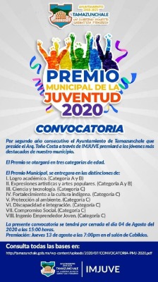 • Por segundo año se abre la convocatoria el Instituto Municipal de la Juventud para el Premio Municipal de Tamazunchale donde los jóvenes que tengan algún proyecto que pueda ayudar al municipio pueden participar.