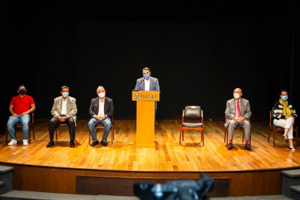 En rueda de prensa realizada en el auditorio Rafael Nieto, también acompañaron al Rector Alejandro Zermeño, la responsable del Comité Covid-19 de la UASLP, maestra Claudia Elena González Acevedo; el jefe de Servicios Escolares, maestro Juan Manuel Buenrostro Morán y el presidente de la Federación Universitaria Potosina, Óscar Sanjuanero.