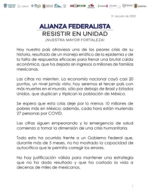 Diez integrantes de los Gobernadores de la Alianza Federalista (opositores al partido Morena), publicaron un documento para exigir la destitución del subsecretario de Prevención y Promoción de Salud, Hugo López-Gatell, esto tras argumentar un mal manejo de la pandemia del Covid-19, sin embargo, uno de los que presuntamente firmaron la petición, el gobernador de Chihuahua, Javier Corral, se desdijo, y deslindó de la solicitud, quedando en pie la exigencia de ocho mandatarios estatales.