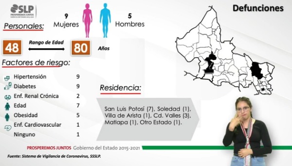De las nuevas 14 defunciones, se dio a conocer que las víctimas corresponden a nueve mujeres y cinco hombres, con un rango de edad de 48 a 80 años, con residencia en los municipios de la capital (7); Ciudad Valles (3); y los municipios de Soledad, Villa de Arista, Matlapa, y otro estado, registraron un fallecimiento; mismas que presentaban como antecedentes factores de riesgo de hipertensión (9); diabetes (9); enfermedad renal crónica (2); edad (7); obesidad (5); enfermedad cardiovascular (1); ninguno (1).