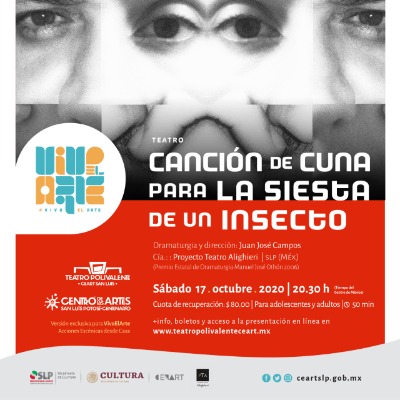 • Como parte de los programas que realiza el Centro de las Artes (CEART) de San Luis Potosí, este sábado 17 de octubre, presentarán l obra de teatro titulada "Siesta de un Insecto", a partir de las 20:30 horas, a través de redes sociales.