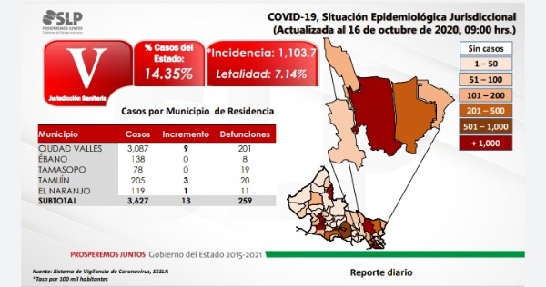 Ciudad Valles presenta al corte de este día un incremento de nueve contagios para un total de 3 mil 087 pacientes y 201 víctimas mortales, una de ellas falleció en las últimas horas.