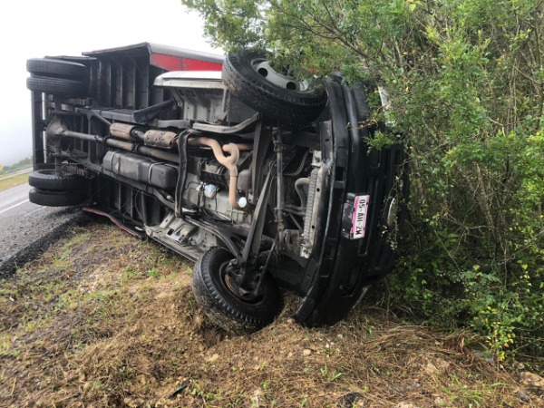 Este sábado por la tarde se registró la volcadura de una camioneta marca Ford color rojo, modelo 2007, con caja cerrada, en el kilómetro 73 de la carretera libre Valles-Rioverde.