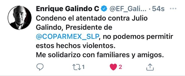 Condeno el atentado contra Julio Galindo, Presidente de @COPARMEX_SLP, no podemos permitir