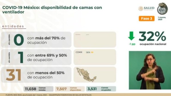 La baja en casos de la pandemia se refleja en una menos ocupación hospitalaria de camas en hospitales, sobre todo las equipadas con ventilador, que a nivel nacional bajó en 1 punto porcentual. Que a la fecha solo la CDMX tiene la máxima ocupación de entre el 69 y 50%; el resto de todas las entidades, 31, la ocupación es de menos del 50%.