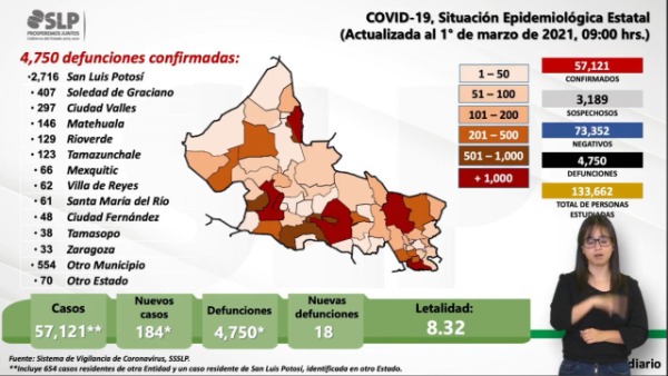184 contagios y 18 defunciones hoy por Covid-19 en SLP; Cd. Valles suma un caso y una muerte más