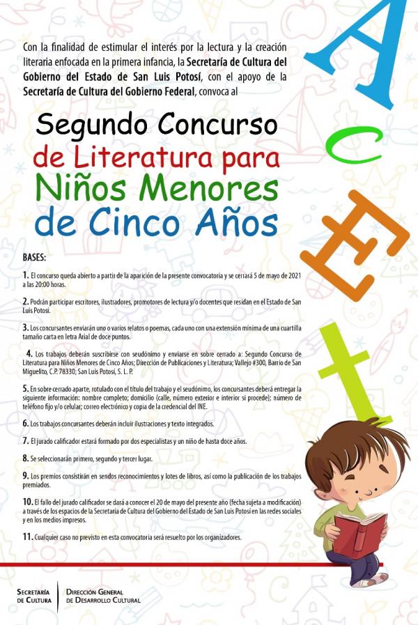 Con el objetivo de promover el acercamiento a la literatura en niñas y niños menores de 5 años, la Secretaría de Cultura (SECULT), invita al Segundo Concurso Literario, en el que podrán participar las y los escritores, ilustradores y promotores de lectura y/o docentes que residan en el estado de San Luis Potosí con la inscripción de uno o varios relatos o poemas.La convocatoria se encuentra abierta y cierra el 5 de mayo de este mismo año, por lo que las y los participantes deberán suscribirse con seudónimo, y enviar sus trabajos con una extensión mínima de una cuartilla tamaño carta en letra Arial de doce puntos, en sobre cerrado a: "Segundo concurso de Literatura para niñas y niños menores de cinco años"; Dirección de publicaciones y literatura, Vallejo #300, Barrio de San Miguelito, CP 78330, San Luis Potosí, SLP.