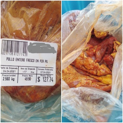En este sentido, la afectada, Cristela Hernández, detalló que su caso ocurrió hace algunos días, cuando acudió al establecimiento antes mencionado y adquirió un pollo, por las prisas, no lo reviso, y no fue hasta que llegó a su domicilio, justo cuando lo iba a preparar, cuando dio cuenta que se encontraba en mal estado, mismo que había tenido un costo de 127 pesos, cuyo olor que desprendía, era nauseabundo.