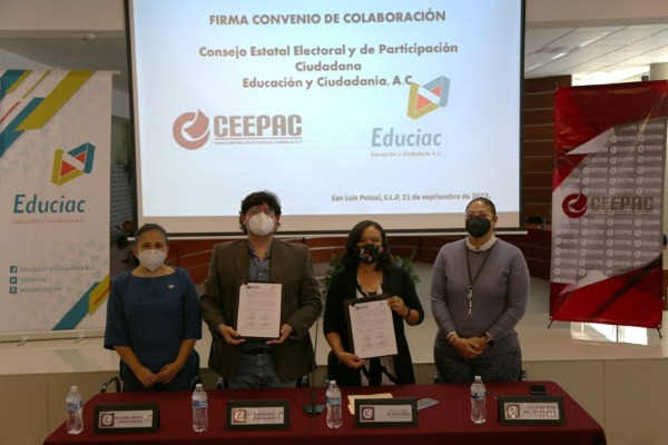 Se firmó Convenio General de Colaboración entre el Consejo Estatal Electoral y de Participación Ciudadana (CEEPAC) y Educación y Ciudadanía, A.C. (EDUCIAC), las y los encargados de suscribir el convenio fueron, por parte del CEEPAC Paloma Blanco López, Consejera Presidenta y Roble Ruth Alejandro Torres, Secretaria Ejecutiva, por parte de Educación y Ciudadanía Jesús Rogelio Córdova Nava, Director General y Laura Adriana Godínez Esparza, Administradora.