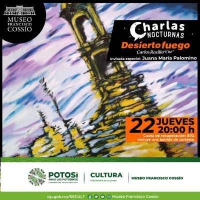 Para despedir la exposición "Desierto Fuego" de Carlos Rosillo "Ché" el Museo Francisco Cossío, la Secretaría de Cultura de San Luis Potosí invita a la Charla Nocturna que se llevará a cabo este jueves 22 de septiembre a las 20:00 horas en las instalaciones de este recinto cultural.