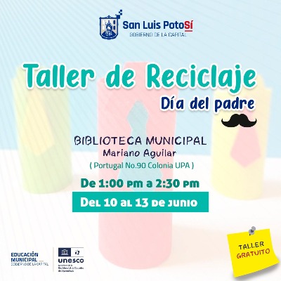 El Sistema de Bibliotecas Municipales invita a la población a participar en los talleres de reciclaje, cineclub y talleres de elaboración de regalos para los padres como el Taller de reciclaje "La camisa de papá", en la Biblioteca Municipal Asunción Izquierdo Albiñana, ubicada en Euclides 170-A Col Progreso, de lunes a viernes de 10:00 am a 12:00 pm y 3:00 pm a 5:00 pm durante todo el mes de junio y en la Biblioteca Municipal Mariano Aguilar, ubicada en Portugal No.90 Colonia UPA, del 10 al 13 de junio de 1:00 pm a 2:30 pm.