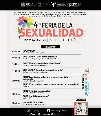 Este jueves 22 de mayo de 2025, la Facultad de Psicología de la Universidad Autónoma de San Luis Potosí (UASLP), a través del Programa de Promoción e Investigación de la Salud Sexual (PISSE) y del Centro de Extensión y Responsabilidad Social (CERS), llevará a cabo la 4ta. Feria de la Sexualidad, evento que contará con un programa que incluye conferencias, foros y la instalación de un mercadito temático, en un horario de 10:00 a 14:00 horas, con entrada libre.