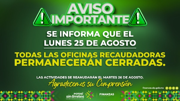 • La Secretaría de Finanzas (Sefin) informó que, con motivo de la conmemoración de San Luis Rey de Francia, día feriado oficial, las oficinas recaudadoras de las cuatro regiones del Estado permanecerán cerradas el lunes 25 de agosto.