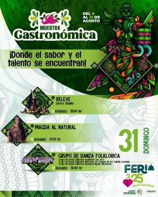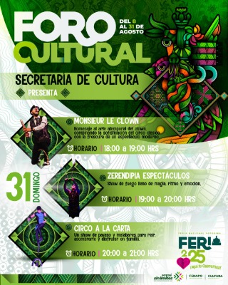 El ritmo no se detendrá: a las 8:00 p.m., el Circo a la Carta llegará al Foro Cultural y la danza tradicional volverá a tomar la Muestra Gastronómica. Posteriormente se realizará el evento de clausura en El Foro, antes de dar paso al esperado concierto de Grupo Frontera.