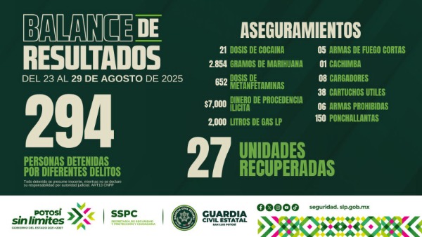Tan solo en el periodo comprendido del 23 al 29 de agosto del año en curso, la Secretaría de Seguridad y Protección Ciudadana del Estado, informó la detención de 294 personas, nueve de ellas quedaron a disposición de la Fiscalía General de la República y 285 a la Fiscalía General del Estado, logrando, de esta manera, evitar su reincidencia.