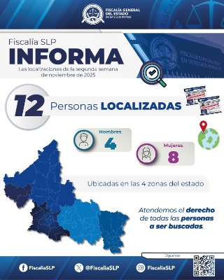 La Fiscalía General del Estado de San Luis Potosí (FGESLP), a través de la Fiscalía Especializada en Materia de Derechos Humanos, localizó a 12 personas durante la segunda semana de noviembre.