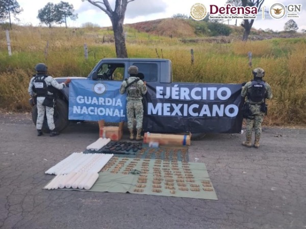 En el municipio de Cotija, se localizó un vehículo en aparente estado de abandono que contenía un fusil, 20 cargadores, 1,790 cartuchos y 52 kilos de material explosivo.
