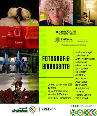 La Secretaría de Cultura de Gobierno del Estado invita al público a disfrutar de la exposición fotográfica "Colectiva Fotografía Emergente", que se presenta en el Museo de las Culturas del Municipio de Matehuala, misma que reúne el talento de quince artistas como Abrahán Verástegui, André Betancourt, Andrea Alfaro Guajardo, Carla Izaguirre, Sol Durán, Kevin Reydezel, Luz Almazán, María Santos, Mar Medina, Mayela López, Nuria Serrano, Octavio Vázquez, Celeste Hernández, Valeria del Regil y Valentina Campillo.