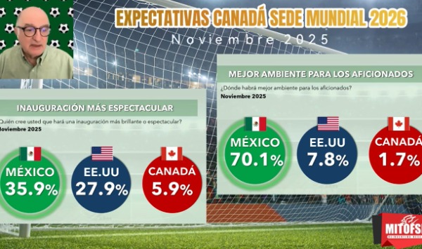 Mitofsky también registró que crece la idea de que el próximo campeón será europeo, debido a la caída en expectativas sobre Brasil y Argentina y el repunte de Alemania e Inglaterra. Pero más allá del favorito, la encuesta dejó claro que cada país ofrecerá algo distinto, Estados Unidos pondrá la organización y los estadios, Canadá la seguridad, y México una inauguración espectacular y el ambiente que siempre caracteriza a la afición.