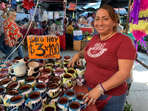 La comerciante Laura Alicia Ortega Monarca, en el tianguis Miguel Jiménez de Ciudad Valles, ofrece jarritos de barro ideales para café, chocolate, atole, champurrado y ponche, justo en esta temporada de frío. Señaló que actualmente los tiene en promoción de tres por 100 pesos, lo que ha generado buena respuesta entre los compradores, sobre todo por sus precios accesibles.