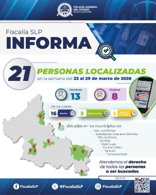 Como resultado de los trabajos de búsqueda y localización realizados de manera coordinada entre la Fiscalía General del Estado de San Luis Potosí (FGESLP) con autoridades de los tres niveles de gobierno, durante la semana comprendida del 23 al 29 de marzo se logró la localización de un total de 21 personas en distintos municipios del Estado potosino.