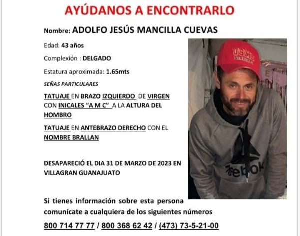 Se trata de Adolfo Jesús Mancilla Cuevas, de 43 años de edad, quien fue visto por última vez el 31 de marzo del año 2023 en La Purísima, Villagrán, Guanajuato, por lo cual activó y mantiene la alerta la Comisión Estatal de Búsqueda de Personas (CEBP) de aquel lugar.