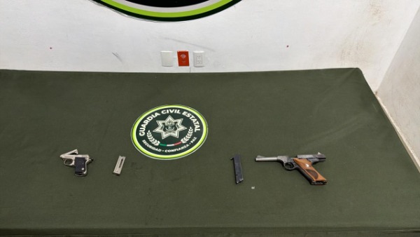 Luego de realizarles una revisión les encontraron dos armas de fuego cortas (pistolas) con cargador desabastecido, ambas calibre .22 tipo escuadra, por lo que de inmediato fueron detenidos.