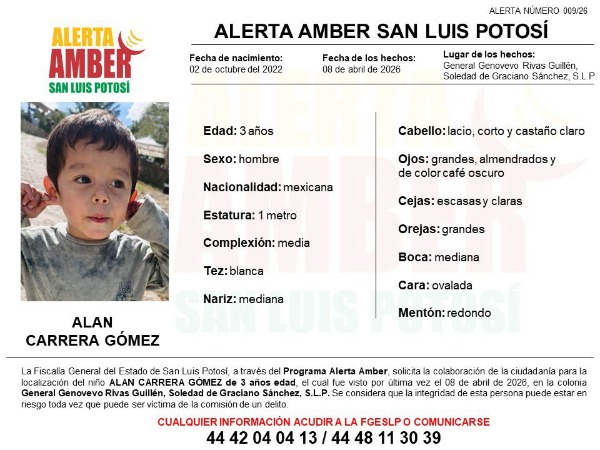• La Fiscalía General del Estado de San Luis Potosí (FGESLP) activó una ficha de Alerta Amber para la pronta localización de Alan Carrera Gómez, quien fue visto por última vez el 8 de abril de 2026 en la colonia General Genovevo Rivas Guillén, en el municipio de Soledad de Graciano Sánchez.