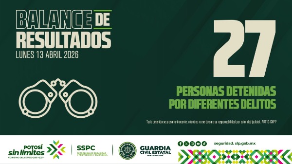 Como resultado de labores de prevención y trabajos de inteligencia que se implementan en las cuatro regiones, la Guardia Civil Estatal (GCE) detuvo, en las últimas horas, a 27 personas por su probable participación en distintos hechos constitutivos de delito, fortaleciendo la Estrategia Integral de Seguridad en San Luis Potosí.