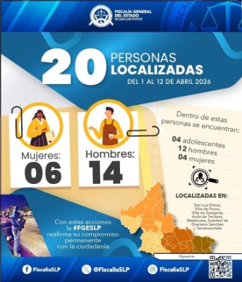 La Fiscalía General del Estado de San Luis Potosí (FGESLP), a través de la Fiscalía Especializada en Materia de Derechos Humanos, realizó acciones de búsqueda y localización durante el 1 al 12 de abril del presente año, con las que se lograron ubicar a 20 personas que contaban con fichas de búsqueda activas.
