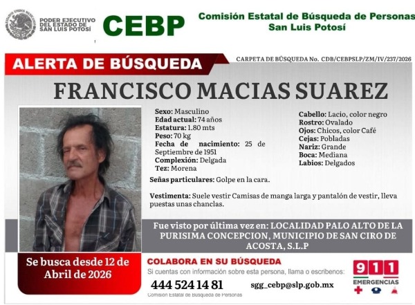 Se trata de Francisco Macías Suárez, de 74 años de edad, visto por última vez el 12 de abril pasado en la comunidad de Palo Alto de la Purísima Concepción, en el municipio sancirense.