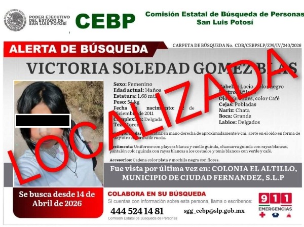 Se trata de Victoria Soledad N., de 14 años de edad, quien fue vista por última vez en la colonia El Altillo del municipio de Ciudad Fernández y desde entonces se reportó e inició la búsqueda.
