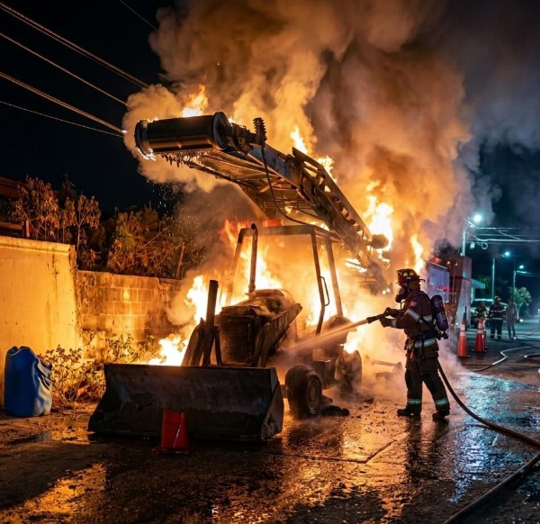 • Un aparente cortocircuito originó un incendio que afectó maquinaria pesada utilizada en trabajos de rehabilitación sobre la avenida Pedro Antonio Santos, generando alarma entre vecinos durante la madrugada.