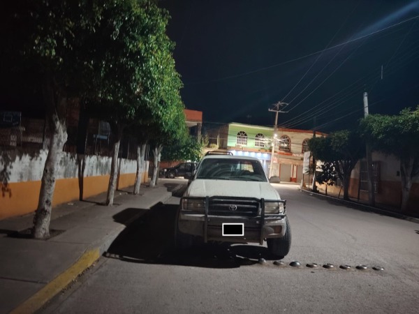 Dentro de las acciones preventivas y de seguridad, los agentes estatales observaron en la esquina de las calles Benito Juárez y Porfirio Díaz del barrio Primero, una camioneta Toyota Tacoma, color blanco, modelo 2000, con placas del estado potosino.