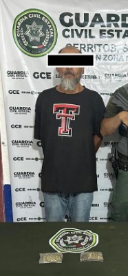 Fue en la esquina de las calles Benito Juárez y Nicolás Bravo de la cabecera municipal cerritense, donde los oficiales estatales interceptaron al sospechoso, Gabino R., de 52 años de edad, a quien tras una revisión le encontraron dos bolsas con el enervante y los llevaron preso, a disposición de la Fiscalía General del Estado (FGE) por delitos contra la salud.