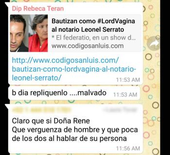La diputada local de San Luis Potosí, Rebeca Terán Guevara, solicitó en grupos de Whatsapp de la Organización e Mujeres Priistas replicar el escarnio en contra del notario público Leonel Serrato Sánchez a quien las redes sociales le llamaron #LordVagina derivado de la interpretación de un comentario que el también analista político hizo en un programa radiofónico.