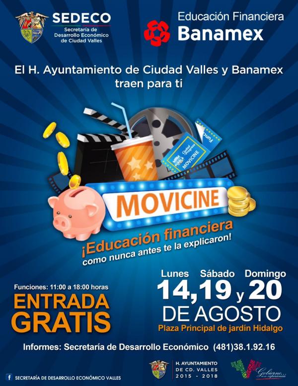 El Ayuntamiento de Ciudad Valles a través de la Secretaría Municipal de Desarrollo Económico y la empresa Banamex, llevarán a cabo del 14 al 23 de agosto la presentación gratuita de un Cine Móvil con la finalidad de transmitir películas que inculquen la cultura del ahorro y sobre los trámites financieros.
