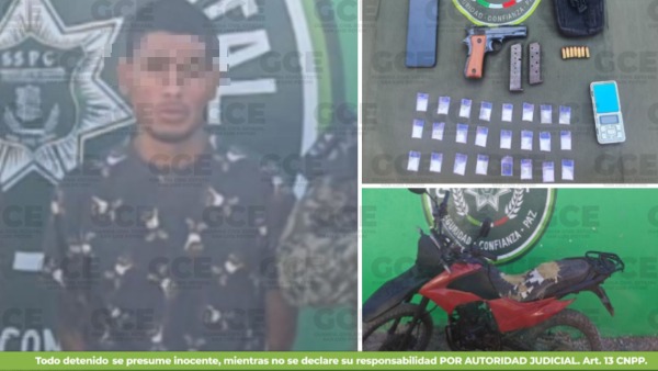 El presunto, Wilver "N" de 23 años, fue detenido con un arma de fuego, tipo pistola, calibre .380, con dos cargadores y siete cartuchos útiles, 24 dosis de "cristal", una motocicleta vento modelo 2022, color rojo, un teléfono celular, una bascula y un bolso.