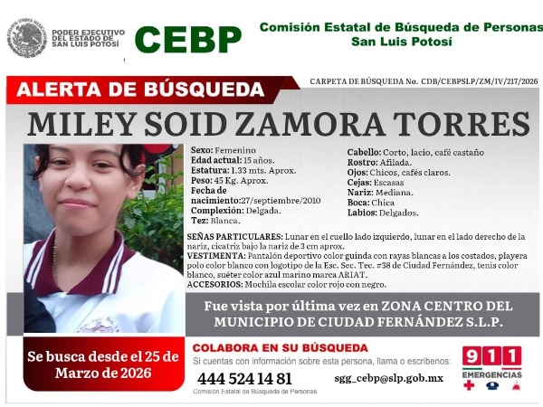 Se trata de Miley Soid Zamora Torres, de 15 años de edad, vista por última vez el pasado 25 de marzo del año en curso, en la zona centro del municipio de Ciudad Fernández.