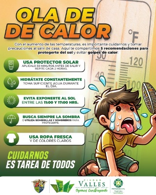 • Ante el pronóstico de incremento en la temperatura para los próximos días, el H. Ayuntamiento de Ciudad Valles, a través de la Dirección de Protección Civil Municipal, emitió una serie de recomendaciones preventivas con la finalidad de salvaguardar la salud y seguridad de la población.