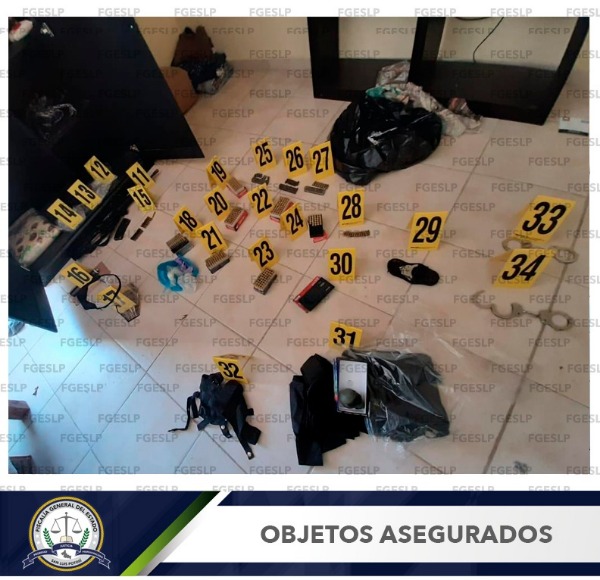 La Fiscalía General del Estado de San Luis Potosí (FGESLP) llevó a cabo dos cateos en Rioverde, en donde logró el aseguramiento de 7 armas de fuego largas, más de 1 mil 661 cartuchos útiles, 98 cargadores de armas de fuego de diversos calibres, 3 granadas de fragmentación, 4 motocicletas, cerca de 36 kilos de marihuana y equipo táctico, entre otros objetos.