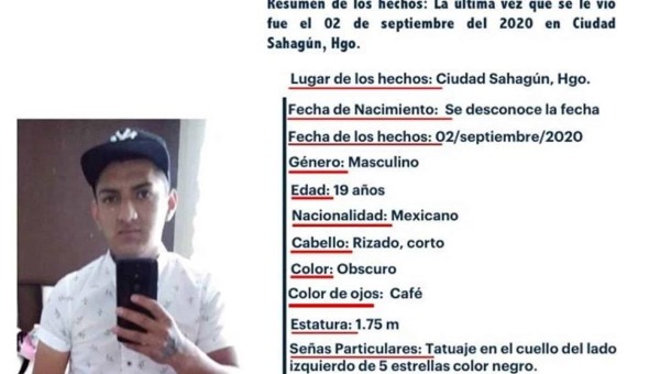 José Luis Salazar García, de 19 años de edad, desapareció el pasado 2 de septiembre en Ciudad Sahagún, por lo que la Comisión de Búsqueda de Personas del Estado de Hidalgo (CPBEH) emitió un reporte en su favor.