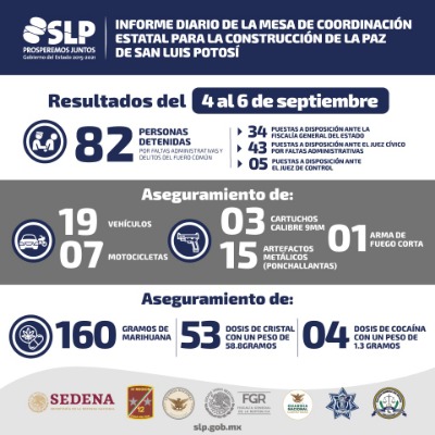 La Mesa de Coordinación Estatal para la Construcción de la Paz, informó que 19 vehículos y 7 motocicletas fueron recuperadas en operativos de seguridad en las cuatro regiones de San Luis Potosí, durante el fin de semana correspondiente al 4, 5 y 6 de septiembre, además, se decomisaron 160 gramos de marihuana, 58.8 gramos de cristal y 1.3 gramos de cocaína.