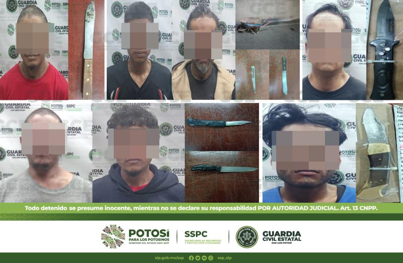 Oficiales de la Guardia Civil Estatal (GCE) detuvieron a siete presuntos tras asegurarles armas punzocortantes en diferentes puntos de la capital potosina; con ello se logró evitar la probable comisión de actos ilícitos y/o antisociales.